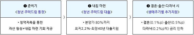 - 생애주기별 금리 인하 : 결혼 0.1% 인하, 출산 : 0.5%p 인하, 다자녀 : 0.2%p 인하