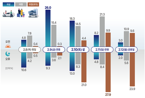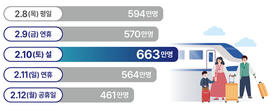 연휴기간동안 일평균 570만명 대이동할것으로 전망이되고 특히 설 당일엔 663만명으로 최다인원이 움직일것으로 예상됩니다.